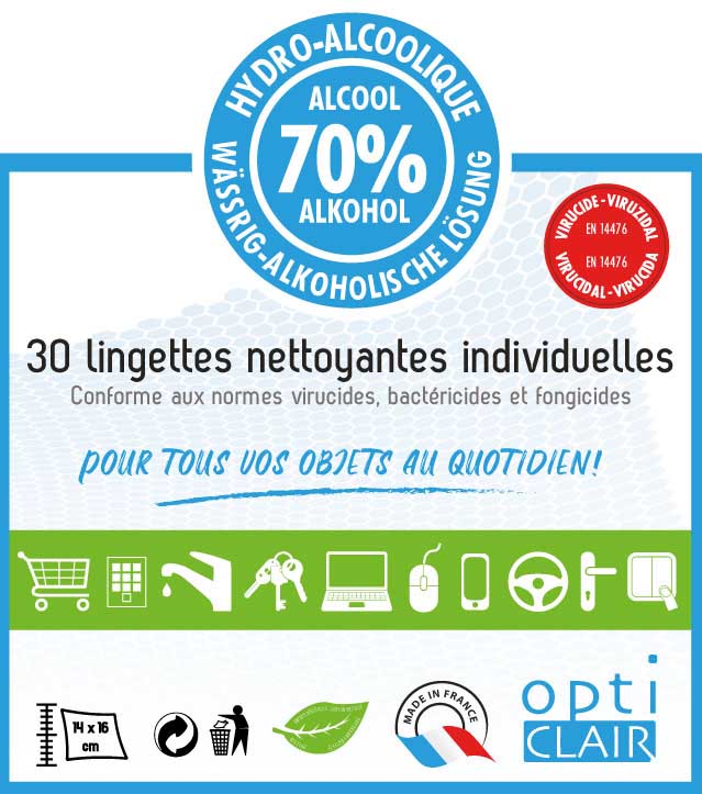 Lingettes hydroalcooliques, nettoyantes, virucides, désinfectantes, bactéricides et fongicides Opticlair - Varionet