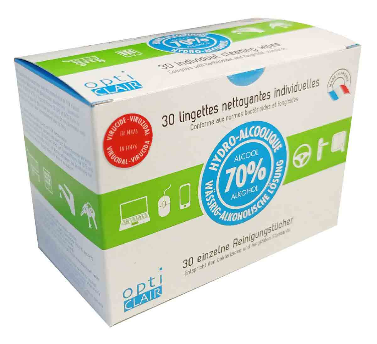 Boite de 30 lingettes virucides désinfectantes Opticlair idéales pour les déplacements car faciles d'emploi et peu encombrantes, made in France.